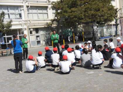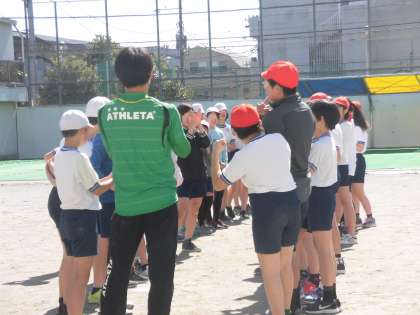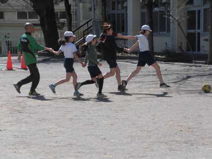 手をつなぐルールも工夫の一つです。ルールを守ってみんなで思い切りサッカーを楽しむことができました。様々な工夫を通して楽しく学ぶことができたサッカー教室。2時間があっという間に過ぎてしまいました。試合後は互いのがんばりをたたえ合いました。授業の最後に、ご指導いただいたコーチの皆さんにお礼をしっかり伝えました。