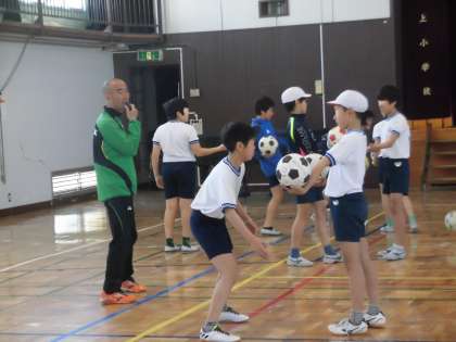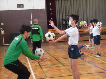 ボールを巧みに操る練習もペア学習で楽しく学びました。サッカーで大切なことの一つは、仲間の気持ちをくみ取ることです。みんな互いに協力し合い、励まし合い、練習を重ねました。