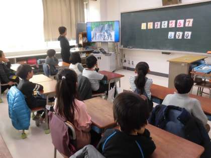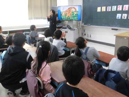 動物の絵本の英語での読み聞かせを聞きながら、数字に慣れ親しみました。クイズ形式で答えていくため、子供たちも自然に英語で表現しています。実際の動物の写真で身長や体重の比べっこもしました。