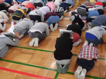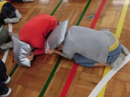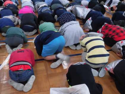 地震の時は、落下物や転倒してくる物などから自分の体を守ることが大切です。特に頭を守る姿勢をとります。全体で「ダンゴムシのポーズ」の練習をしました。頭を守ることのできる何かがあるときは利用することも学びました。みんなしっかり訓練に取り組むことができました。