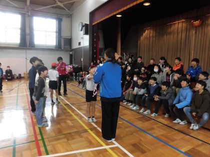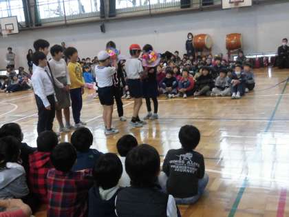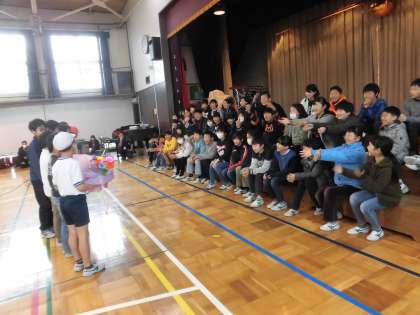4年生の出し物です。元気いっぱいに楽しいコントを披露しました。6年生のよさを「やさしくて、おもしろいところ」と表現しました。劇の中で登場した2つの手作り花束。6年生の人数分の花が色とりどりに咲いています。担任が代表で受け取りました。心のこもったすてきなプレゼントです。