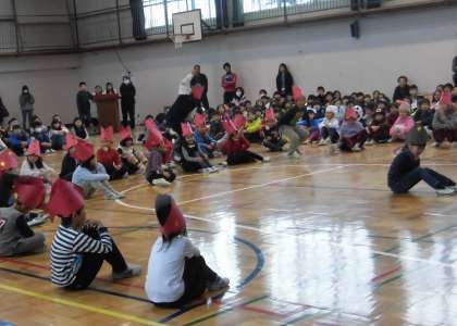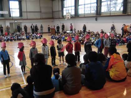 2年生は、6年生に感謝の気持ちを込めてメッセージをおくりました。舞台は「スイミー」の世界です。「休み時間は一緒に遊んでくれました。けがをしたときには大丈夫と声をかけてくれました。けんかをしたときは仲直りのために励ましてくれました。なかよし班ではたくさんお話してくれました。悲しいときは元気づけてくれました。頼りになった。うれしかった。卒業はさみしいけれど、ありがとうを伝えます。」6年生への信頼がいっぱい詰まったのメッセージでした。