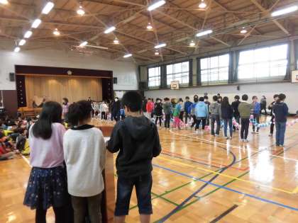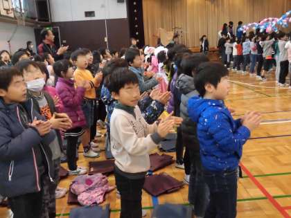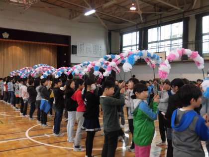 3月8日、全校のみんなが大好きな6年生に感謝の気持ちを伝える「6年生を送る会」が開かれました。この日を迎えるために、どの学年も練習を重ねてきました。自分たちでたくさんアイディアを出し合い創り上げてきました。今日は5年生がリーダーシップを発揮しました。司会進行は4年生と5年生が協力してがんばりました。最初に6年生を花道で迎えます。みんなの大きな拍手が体育館に鳴り響きます。