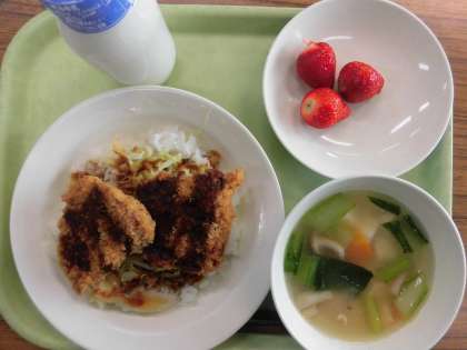 3月20日は、平成29年度最後の給食の日でした。今日の給食は、6年生の卒業をお祝いする献立です。みそかつ丼、しょうがの香るごしょく汁、いちごが並びました。給食室からメッセージが届きました。「今日は、6年生の卒業をお祝いする献立です。また、みなさんの進級をお祝いする献立です。楽しい給食時間をすごしてくださいね。4月に、ご進学したみなさんにお会いできるのを楽しみにしています。給食室一同」この一年、苦手なものを食べることができるようになったと自分のがんばりを振り返る子がたくさんいました。給食をいっぱい食べて元気に成長しました。