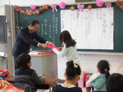 各学級では、担任から一人一人の子供たちに修了証が渡されました。この1年間の成長を伝えながら心を込めて渡しました。子供たちもその気持ちをしっかり受け止め、真剣に向き合っていました。子供たちの1年間の努力と成長を教職員一同、心からうれしく思っています。一つ上の学年でスタートする4月からの活躍に、期待で胸が大きくふくらみます。