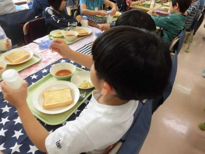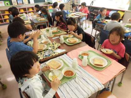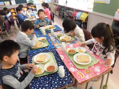 牛乳のキャップについているカバーの取り方にもルールがあります。先生の説明をしっかり聞いて、ていねいにビニルのカバーを取り、小さく丸めることができました。手順よく準備や配膳を終えることができました。元気に「いただきます」をして、みんなで初めての給食をおいしくいただきました。
