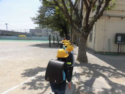 学校でたくさんのことを学んだ1年生。下校の時間になりました。しばらくは先生の指導のもと、友達と班をつくり一斉に帰ります。「元気に学校での生活を終え、そして元気におうちに帰る」・・・この日常の生活を、あたりまえと思うことなく、元気に過ごせたことに感謝していきたいと思います。交通事故にいつも気を付けて、安全で楽しい学校生活を送ってほしいと願っています。