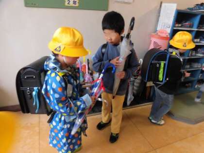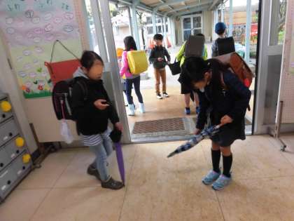 4月18日、朝から雨が降っています。1日のスタートが雨になりましたが、カサをていねいに扱う子がたくさんいて感心しました。人がいないこと確認してカサについたしずくを払う子、カサをていねいに丸める子、自分のカサ置き場にしっかり入れる子。みんな落ち着いて、マナーよく行動していました。1年生もがんばっていました。自分でできる子がたくさいます。時には6年生が、時には1つ上の2年生が優しく声かけしていました。雨の朝、子供たちのすてきな姿に心あたたかくなりました。