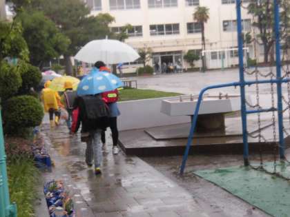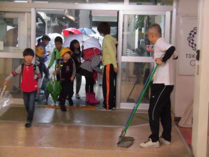 朝から雨が降り続いています。子供たちは傘をさして登校しました。昇降口が雨のしずくですぐに濡れてしまいます。教員が子供たちに声をかけながら安全を促しました。学校主事は子供たちが滑らないように、床拭きを何度も繰り返しました。子供たちが安全に生活できるよう様々な立場から見守っています。