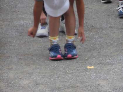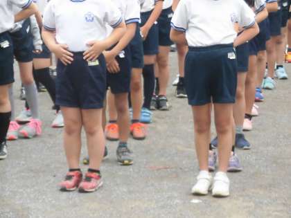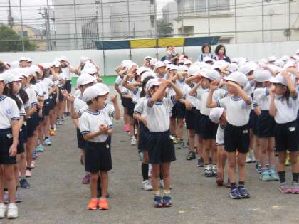 5月の体育朝会の様子です。運動会に向けて、体育の集団行動の基礎を確認しました。みんなで集まるときの帽子の色は白。上着はしっかり短パンの中に入れて安全を確保します。くつのひもがほどけていないか確認します。みんなとてもしっかり体育時の服装を整えることができました。