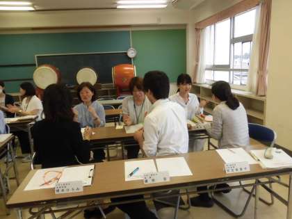 外国語活動が子供たちにとって楽しい授業になるように、また、英語を話してみたい・聞いてみたいと意欲をもつことができる授業になるようにと教員研修が行われました。子供になったつもりで実際にアクティビティに挑戦してみたり、指導者としてどのような英語を使って、子供たちの「気づき」を生み出していくか話し合ったりしました。