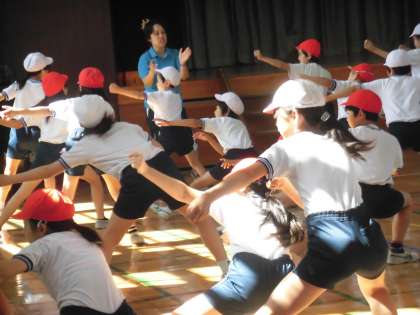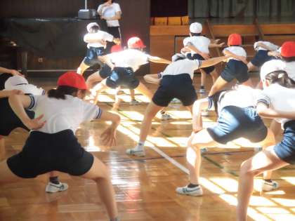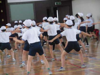 土曜授業の一こまです。5・6年生が体育館で合同練習を行いました。先生の動きを見ながら子供たちも気持ちを込めて表現しています。14日から運動会のための特別時間割がはじまります。
