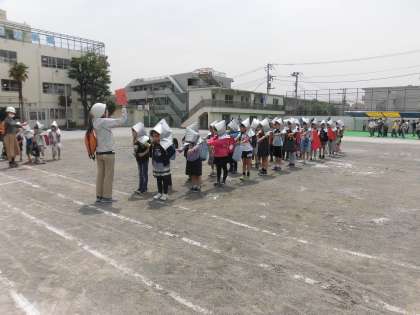 5月12日、引き渡し訓練・引き取り訓練を行いました。今日の訓練は「大きな地震が、世田谷区に起きる可能性があります。」と、総理大臣による警戒宣言が発令されたときのための訓練です。また震度5以上の大きな地震が発生したときの訓練です。この訓練は、教室や校庭に避難するだけでなく、ご家族の方あるいは代理の方に、子供たちの大切な命を確実に引き渡す訓練でもあります。保護者の皆様にとっては引き取りの訓練、学校にとっては引き渡しの訓練、そして子供たちにとってはどのように行動すべきかを考え、かけがえのない自分の命をしっかり守るための訓練です。