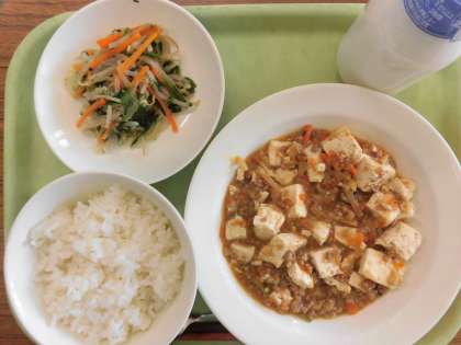 今日の給食は、ごはん・牛乳・麻婆豆腐・塩ナムルです。
