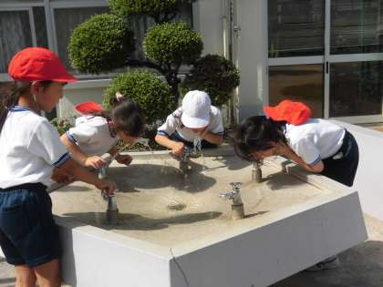 水分の補給をこまめに行うことで熱中症を予防します。たくさん練習に励んだ子供たち、ほんとうにおいしそうに水を飲んでいました。