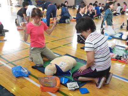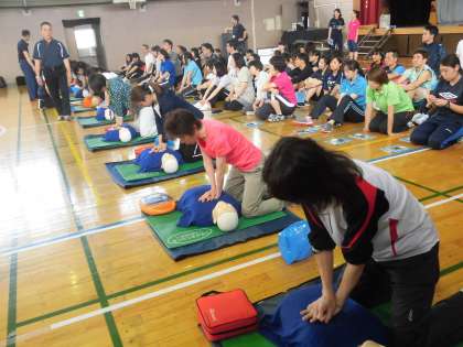 AEDによる除細動についても研修を受けました。早期除細動は、かけがえのない命を救うためにとても重要な対応になります。本校にも正面玄関に設置しています。後日、1・2年生昇降口にももう一つ設置予定です。実際に触れてみて、体験してみて学ぶことで私たち教員の実践力を高めていきたいと考え、毎年全員必ず講習を受けています。