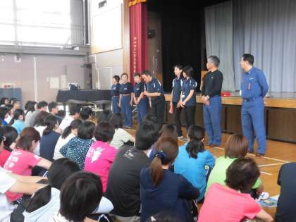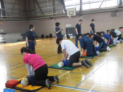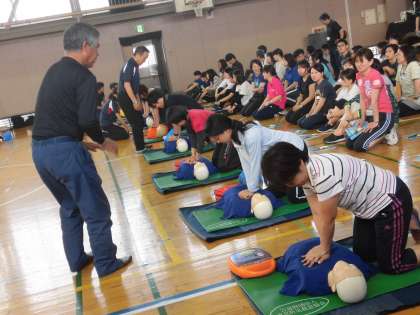 5月16日、「富士の学び舎」の小学校3校の教員が集まり、救急救命講習を受けました。講習の内容は、「応急手当の重要性」「心肺蘇生」「AEDによる除細動」「気道遺物除去」です。一つ一つ丁寧に、消防署の皆様、消防団の皆様にご指導いただきました。この講習会は、毎年必ず実施しています。講習を繰り返すことで、知識と実践力を高めていきます。