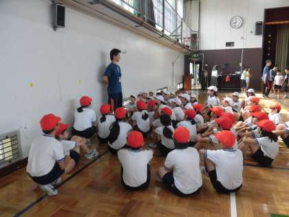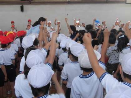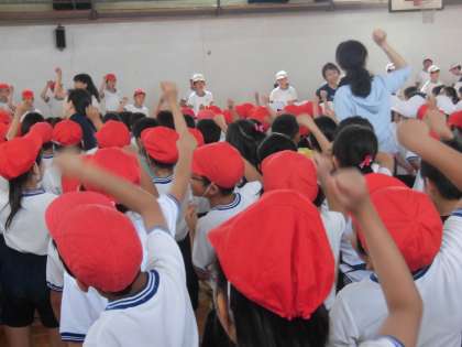 応援団に負けないくらいの大きな声で歌を歌う全校の子供たち。合間に入れる「ゴー」のかけ声に合わせて、こぶしを高らかにあげます。先生からもっと力強くというアドバイスを受け、子供たちの意気込みはますます高まりました。大きな声も出ています。応援団は、互いのがんばりを認め合います。先生からも「よく声が出ていた」と子供たちの努力を認める振り返りがありました。