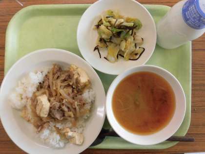 今日の給食は、豚丼・牛乳・みそ汁・きゃべつの塩こんぶかけです。