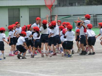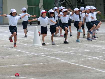 1年生の団体競技の練習の様子です。1年生のかわいらしさと元気さがいっぱい見られる競技になりそうです。本番が楽しみです。