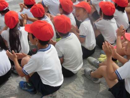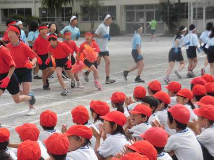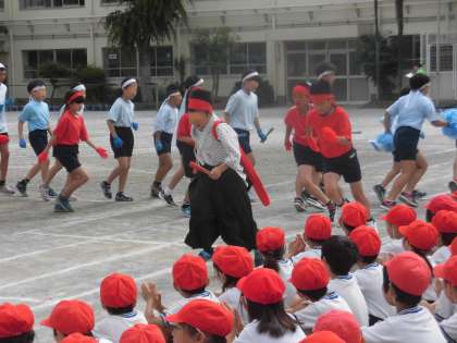 応援団が元気に走って退場します。全校の子供たちは応援団のがんばりを拍手でたたえます。