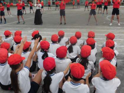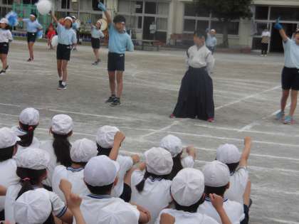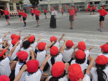 午後の応援合戦の練習をしました。毎朝一生懸命に練習している応援団が紅白の応援をリードします。全校のみんなも心を一つにして声を出し、体を動かしています。