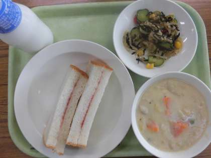 今日の給食は、いちごジャムサンド・牛乳・クリームシチュー・大根とひじきのサラダです。