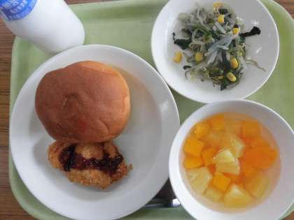 今日の給食は、カツサンド・牛乳・ほうれん草とコーンのソテー・フルーツポンチです。明日の運動会で子供たちの活躍がたくさん見られることを願って立てた献立です。