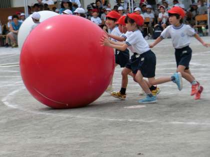 自分たちの体よりも大きい玉を4人で力を合わせて運びました。速く上手に走るための作戦を何度も話し合いました。最初はうまくできなかったコーンを回るスピードも練習ごとに速くなり、子供たちの吸収力と判断力の大きさを感じました。