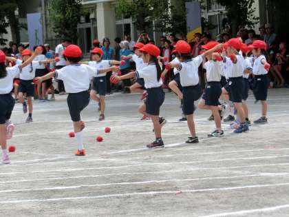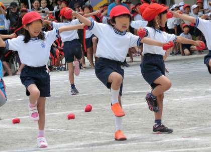 子供たちのかわいいチェッコリダンス。音楽に合わせてポーズをとりながら踊ります。音楽が止まると、玉入れ開始。再びチェッコリダンスを踊り続けるかわいいかわいい1年生に大きな拍手と声援をいただきました。1年生の一生懸命さとかわいらしさでいっぱいの競技になりました。