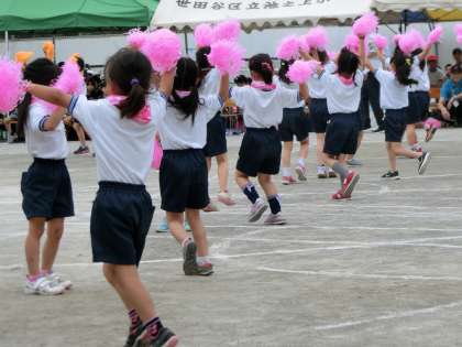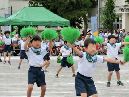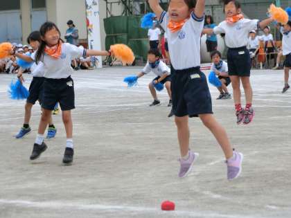 ディズニーの「ステッチ」の歌にのり、4色のポンポンを持って、体全体を使ってかわいらしく元気いっぱいに踊った1年生。「アロハ!」「オハナ!」のかけ声も元気いっぱい。校庭に響き渡りました。弾けるような明るさをいっぱい伝えてくれました。かわいらし1年生に大きな拍手がおくられました。