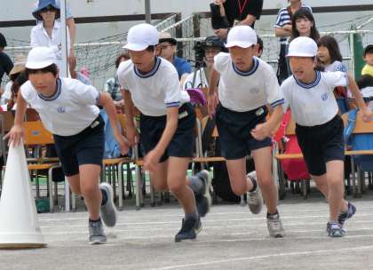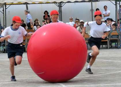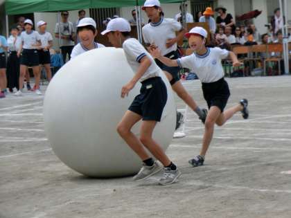 全校児童が力を合わせて取り組む競技の一つが「大玉送り」です。この競技は、6年生が大玉送りをサポートします。全速力で大玉を全校の子供たちに届けます。