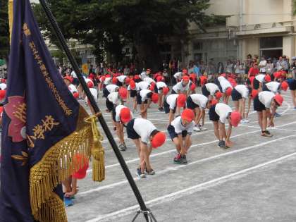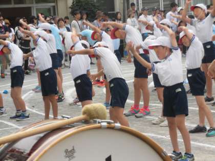 開会式も終わり、運動会の演技がいよいよ始まります。みんなで体をほぐす体操を行いました。しっかり体を伸ばし、さあ、これから自分の力を精一杯発揮してがんばります。