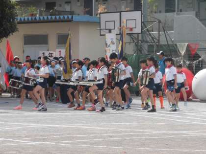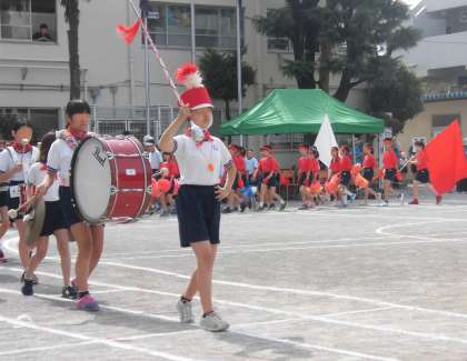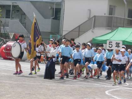 いよいよ運動会が始まります。ピストルの合図が高らかに校庭に鳴り響きました。最初に鼓笛隊が入場します。堂々とした姿勢と目線。気持ちを一つにして演奏する行進曲。毎朝の練習の成果です。続いて校旗を持った児童が入場します。この校旗、とても重たく姿勢を保つのが大変です。でも、さすが6年生。堂々としています。次に応援団、そしてプラカード係を先頭に各学年の子供たちが堂々と行進してきました。