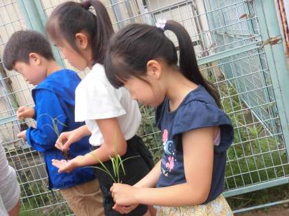 5月30日、池之上小学校の小さな田んぼで田植えが行われました。稲を大切そうに持って植える子供たち。なかなかまっすぐに植えることができません。何度も植え直す子供たちの姿を見て、自然や命を大切にしようとする心を感じました。稲を持つ手からも子供たちの思いが伝わってきます。
