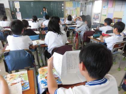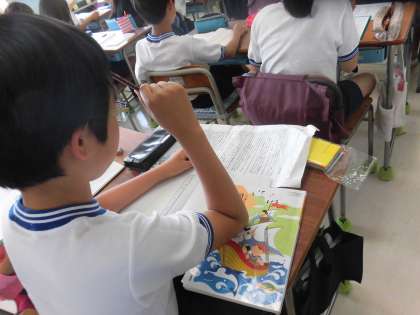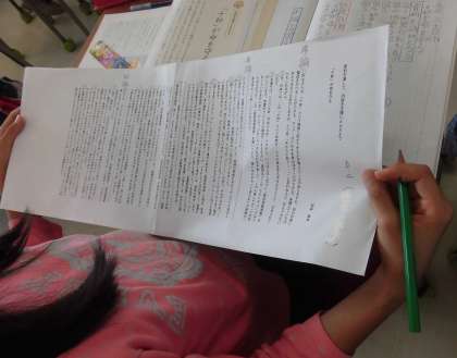 5年生の国語の授業の様子です。この日は説明的文章を使って、「内容を正確に読み取る」学習をしました。本論の内容を、二つの問いの文に着目して読み取りました。文章の全体を読み比べることが重要であるため、担任の手作りのワークシートを使って学びを深めていました。この1枚のワークシートに全文が掲載されています。子供たちは、読み取るためにアンダーラインを引いたり、小見出しをつけたりしていきます。
