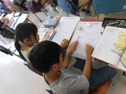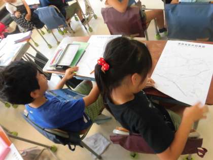 暑い1日になった6月4日。子供たちは落ち着いて学習を進めています。写真は3年生の社会の様子です。世田谷区の学習をしていました。資料を見ながら世田谷区の鉄道の様子を確認していきます。作業を通して多くの「気づき」もあったようです。「こんなにたくさん鉄道があるんだな」と友達と話し合う姿がりました。