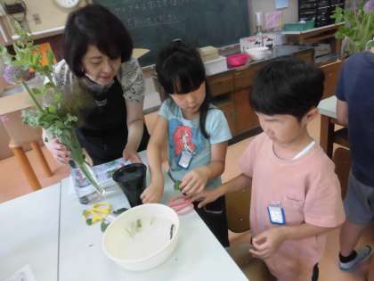6月の花を生ける活動の様子です。今月は、夏の雰囲気が漂ってくる草花に挑戦です。スモークツリー、アリウム、ハツユキソウ、ブルーベリーを提供していただきました。高さや広がりを意識して花を生けました。1年生もがんばりました。