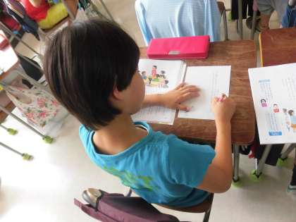 今日の授業を振り返りながら、自分の生活や思いにつなげていきました。書く活動です。教育実習生の先生は、一人一人の様子を見ながら、アドバイスの時間をつくりました。
