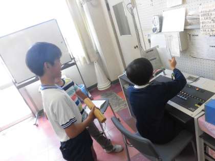毎日の給食時に放送委員会の5・6年生が、学校生活に潤いを与えるための放送を担当しています。3人一組でその日1日の放送内容を考えていきます。放送室をのぞいてみるとチームワークよく委員会の仕事をしています。今日のニュースも子供たち自身が一生懸命に考えた原稿で、話題豊富、とても興味ある内容です。写真はクイズを放送している様子です。