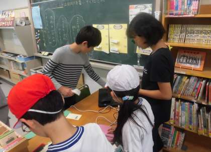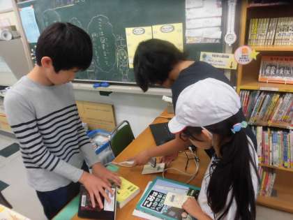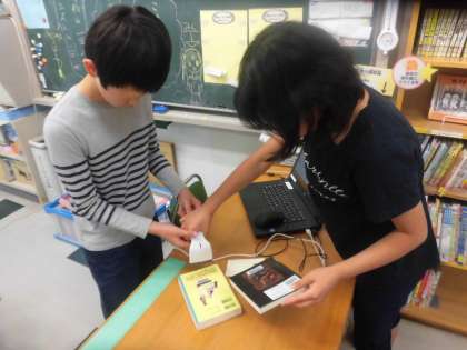 雨の中休み。読書に親しむ子がたくさんいます。図書委員の5・6年生は、必死に本の貸し出しの活動をしていました。今、世田谷区では貸し出しにバーコードを活用しています。子供たちもその手順にすっかり慣れているようです。