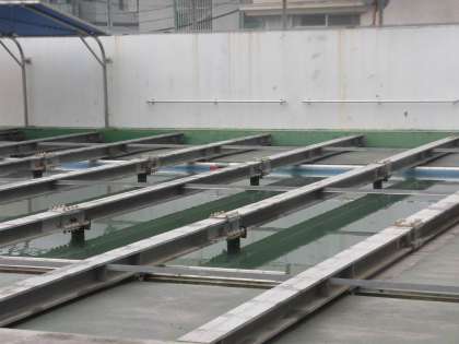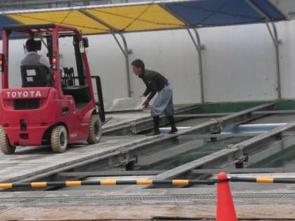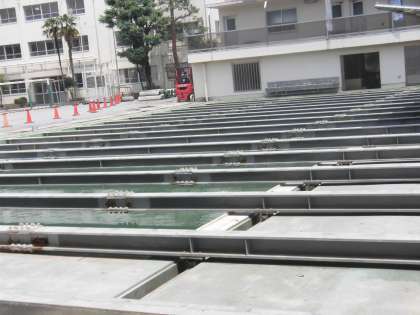 人工芝の下に敷き詰められている重い鉄骨が一つ一つ取り除かれていきます。