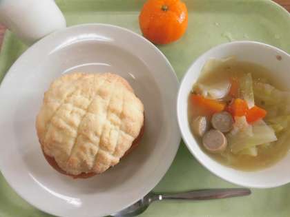 今日の給食は、手作りメロンパン・牛乳・ポトフ・くだものです。