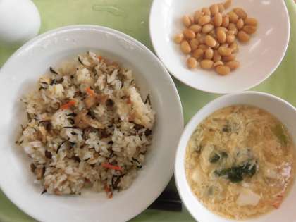 今日の給食は、磯おこわ・牛乳・かきたま汁・ぶどう豆です。