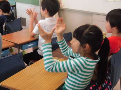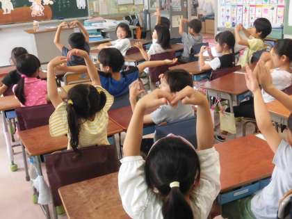 子供たちの話し合いの中で、「あたたかい心」「いじわるな心」「明るい心」「暗い心」など心に視点をあてる意見がたくさん出ました。「あたたかな心(ハート)がどんどん大きくなって、もっともっとあたたかくなる。」と伝えた子供の意見を受けて、手で大きくあたたかくなった心を表しました。みんなでつくる大きなハートがいっぱいできました。拍手もいっぱい。あいさつもとても上手にできました。
