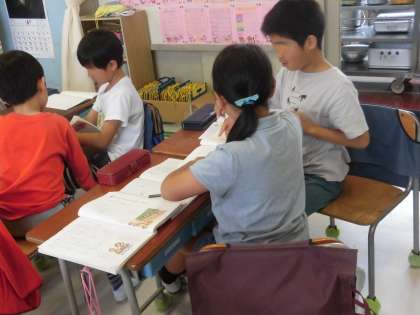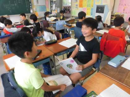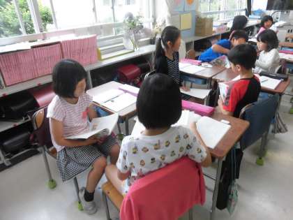3年生の国語授業の様子です。「ののはな」の内容を捉え、「友達と読み方を工夫して読むこと」を1時間の目標にしました。号車ごとに、列ごとに、全員で、個人で、速く、ゆっくり、イメージしながら・・・いろいろな条件が先生から伝えられます。「ののはな」を何度も読む子供たち。音読がとても上手になってきました。今日の中心は、友達との「交流」です。ペア学習をしながら、互いの音読のよさを伝え合いました。