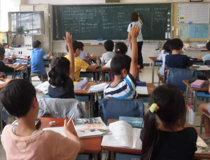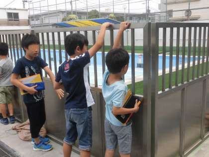プールのフェンスの温度に着目した子もいました。手で触れながら、どの部分があたたかいか冷たいかを意欲的に調べていました。教室に戻った子供たちは友達と意見交流しながら1時間の授業のまとめを行っていました。