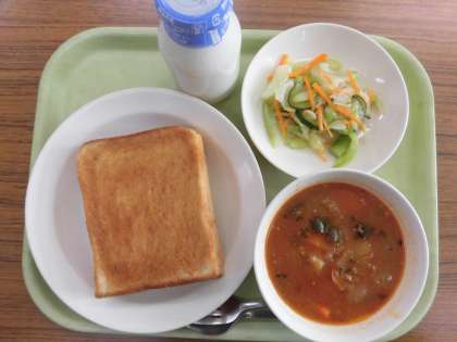 今日の給食は、シナモントースト・牛乳・ハンガリアンシチュー・アスパラガスのサラダです。