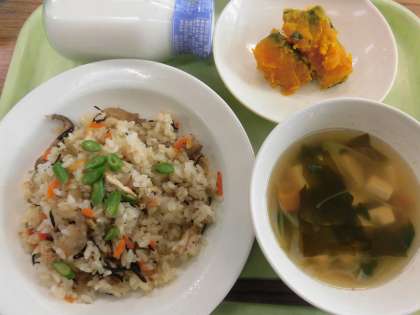 今日の給食は、五目ごはん・牛乳・すまし汁・かぼちゃの含め煮です。