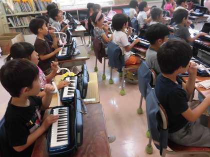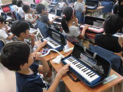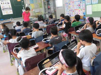 1年生が鍵盤ハーモニカの練習をしていました。みんなでそろって音を出したり聴き合ったりしていました。これからいろいろな曲を演奏していきます。たくさん練習が必要ですが、歌ったり楽器を演奏したりすることは、子供たちにとってわくわくするような楽しい活動の一つになることでしょう。